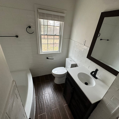 Step into this beautifully renovated bathroom where warmth and elegance come together in perfect harmony. The rich wood-look tile flooring adds a rustic, natural touch, while the crisp white tiles throughout create a clean, fresh backdrop that feels like a breath of fresh air. Thoughtfully designed and expertly executed, this space reflects both style and function—proof that even the most practical rooms can feel like a personal retreat.